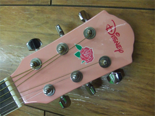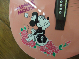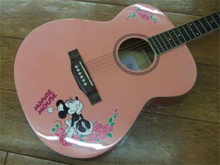 ディズニー(許可とってあるのかな?)のミニーちゃんギターです。 この価格帯のギターはアタリハズレが激しいので、注意しないと・・・。 これに関しては、まあまあアタリかな?というレベルです。 おもちゃぽく見えますが、ちゃんと使えるギターです。 少し(2mm位)サドルを削って下げれば、もっと良くなるはず!