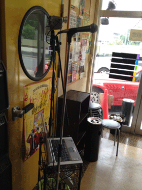 結構コンパクトでしょ!! カメラも音も上の方で撮らないと!! スタンドの足を取ってワゴンに直付け!! ミキサーを立てるのが大変!!