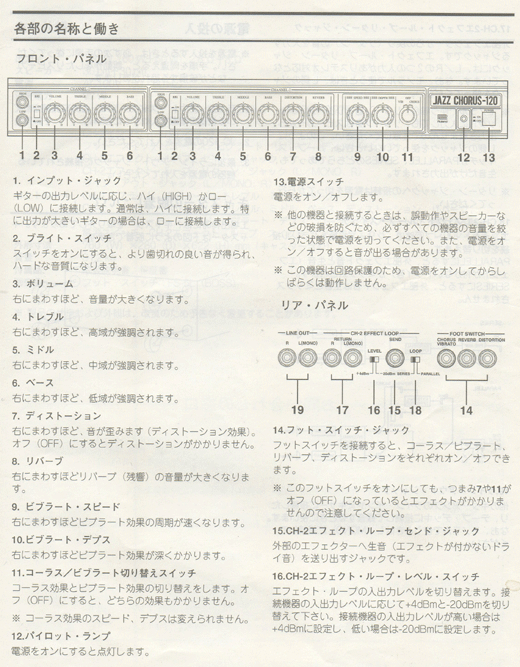 JCは、比較的簡単なアンプです。 入力ゲインがないので、ボリュウムさえ上げれば音は出ます。 ただし、EQ (トレブル・ミドル・ベース