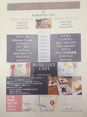 小学校の同級生、S君が参加するバンド ”VINTAGE ”が、BERKELEY CAFF でライブします!