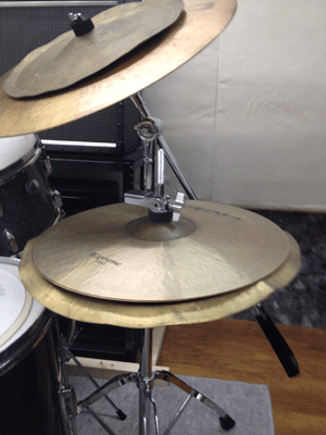写真の上の方、20インチのライドシンバルに載っているのは、14インチの曲げシンバル。