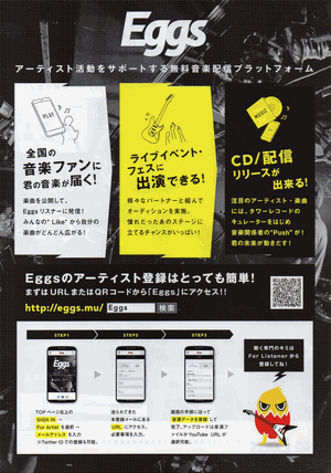・無料で音源を公開 「Eggs」に登録、アプリをダウンロードしている全国のユーザーに対し、自分の音楽を広げることができます。